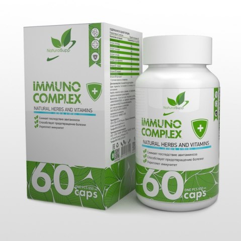 IMMUNO COMPLEX - комплексная пищевая добавка, способствует общему укреплению организма, повышению иммунитета при сезонных простудных заболеваниях. Комплекс обладает противовоспалительными, противовирусными, иммуностимулирующими свойствами, содержит незаменимые вещества, которые помогают бороться с инфекциями, вирусами, противодействуют накоплению свободных радикалов, образующихся при различных воспалительных реакциях. Иммуно Комплекс оказывает следующие эффекты: усиление иммунитета, безопасная и физиологичная ликвидация воспалительных процессов, устранение синдрома хронической усталости, восстановление клеток слизистой оболочки бронхиального дерева и нормализация функций эпителия, в результате чего происходит освобождение от слизи, которая накапливается при пневмонии и хронических бронхитах в бронхах, увеличение выносливости и скорости восстановления при физических нагрузках.
